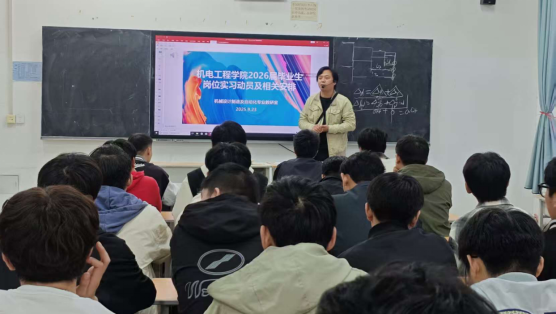 9月23日下午,机电工程学院在敏行楼阶梯教室501室和601室隆重召开 2026届机械设计制造及自动化专业本科毕业生岗位实习动员大会。学院副院长张磊、机制专业教研室主任解玉坤、教师代表和2026届毕业生参会,大会由解玉坤主任主持。
