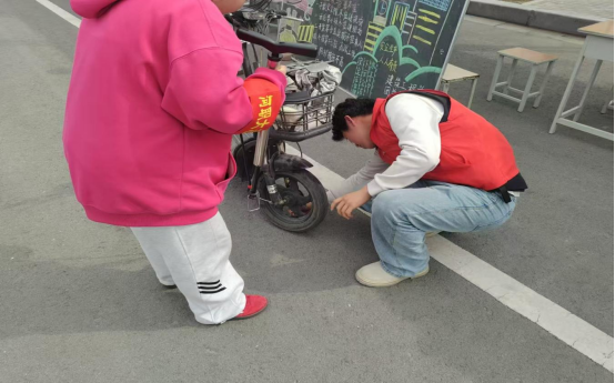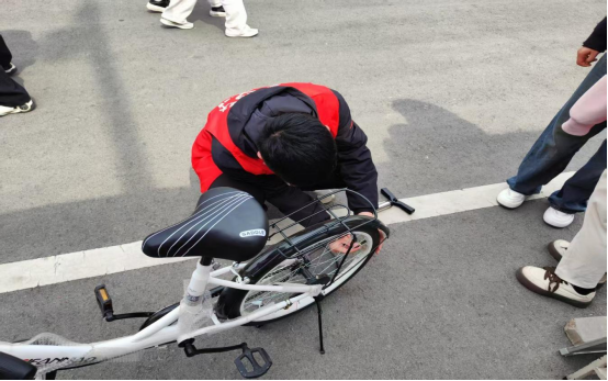 活动当天一早,志愿者们身着统一服装抵达光明路活动现场,迅速搭建维修工位,整齐摆放工具与零件,划分“故障登记区”“维修操作区”“临时停放区”,以有序的场地布置迎接前来送修的同学。