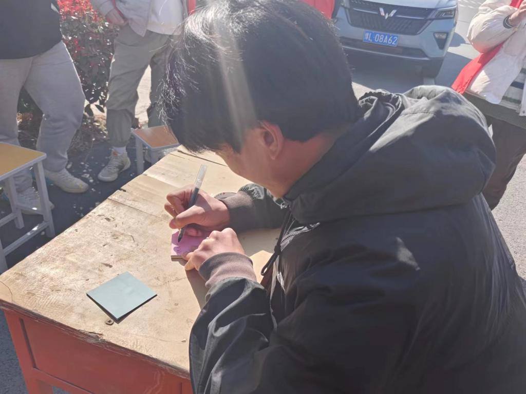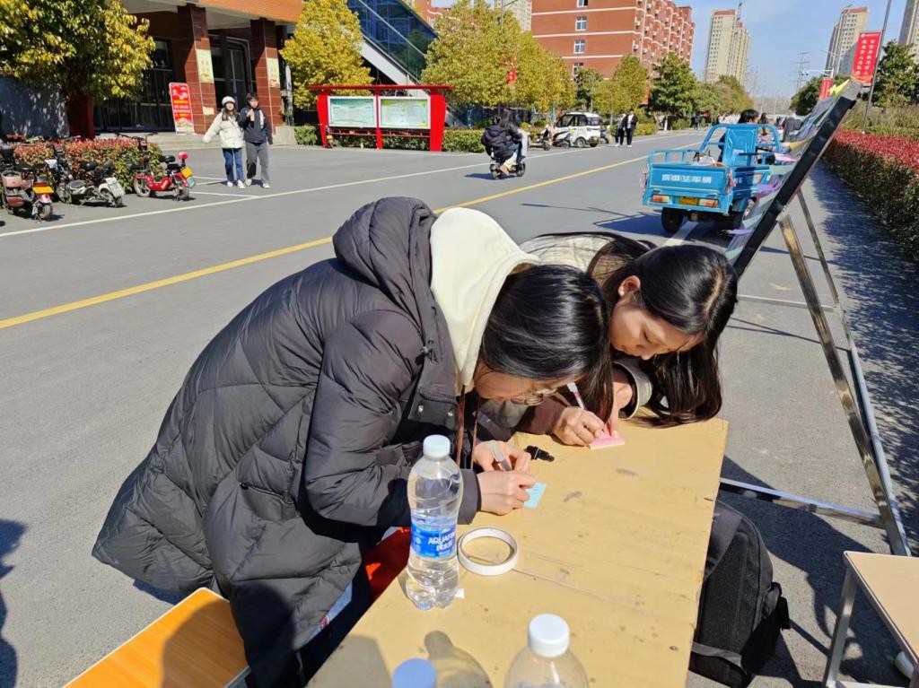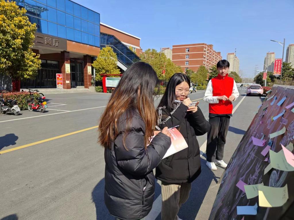 活动开始前,我院志愿者先将活动展板以及桌椅搬至活动地点,做好活动相关准备事宜。活动过程中,志愿者向来来往往的同学们介绍此次活动,并邀请她们在便利贴上写下祝福的话语或者在活动展板上留下自己的名字。活动进行了没一会,便利贴就贴满了整个展板,贴纸上的文字或多,或少,无一不在传达着她们最真挚的情感。活动结束后,志愿者们看着展板上的内容,脸上也都洋溢出幸福的笑容。