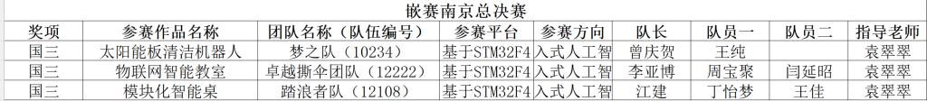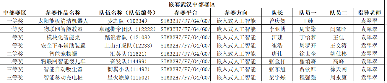 7月29日至30日,“2023年全国大学生嵌入式芯片与系统设计竞赛”中部部赛区决赛在华中科技大学举行,我校机电工程学院组织10支队伍参加了此次比赛。6支队伍晋级中部赛区复赛,其中曾庆贺、王纯同学的作品《太阳能板清洁机器人》(指导教师:袁翠翠),江建、丁怡梦和王佳同学的作品《模块化智能桌》(指导教师:袁翠翠),李亚博、周宝聚和闫延昭同学的作品《物联网智能教室》(指导教师:袁翠翠)均获中部赛区一等奖并晋级全国总决赛,并获国家级三等奖。崔浩、周罗开、王文涛队伍(指导教师袁翠翠),唐伟、徐世全、姚仕彬队伍(指导教师袁翠翠),欧阳金笛、韩宇轩、马嘉队伍(指导教师袁翠翠),张金祥、翟堉森、高峰队伍(指导教师袁翠翠)获中部赛区二等奖。张东旭、贾钦钰、徐天闯队伍(指导教师袁翠翠),梁宇烁、程强强、周永康队伍(指导教师袁翠翠)获中部赛区三等奖。共获得国家级三等奖3项、华中地区一等奖3项,二等奖3项,三等奖2项。