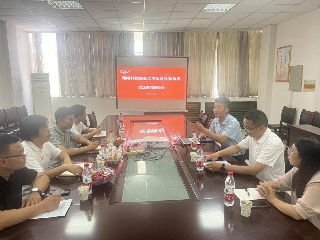 在周口金丝猴食品有限公司同企业负责人进行座谈,企业领导介绍了金丝猴的发展历史与成就、企业的生产基地与产能、企业研发与市场布局和企业对人才培养的相关举措。校企双方就校企合作模式、学时实习与就业、食品行业自动化设备的管理维护与升级改造等方面做了深入的交流,校企双方在学生认知实习、毕业实习等方面达成初步合作共识。